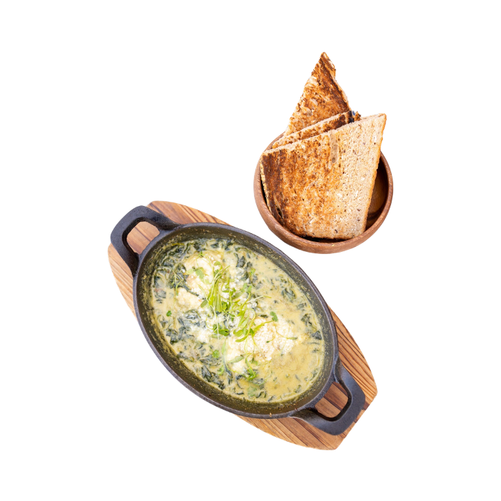 Shakshuka $20.95A rich skillet of two eggs cooked to perfection in our homemade tomato sauce, topped with fresh micro-cilantro and feta cheese. Served with warm 9-grain whole wheat bread.